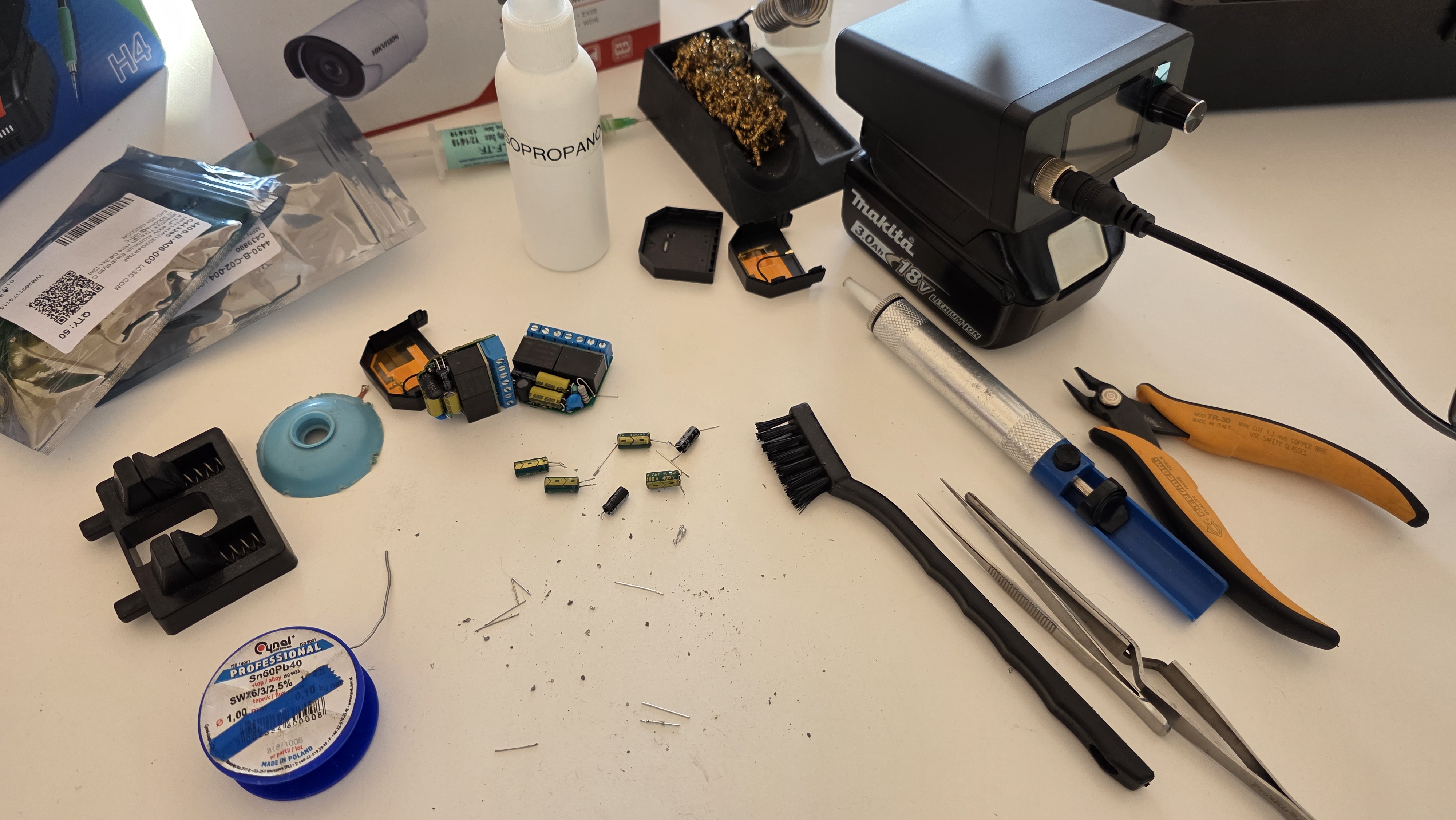 Kasutan veel võimalust teha reklaami sellele jootekolvile, mis pildilt näha. Köögilaual pistikupesasid ei ole ja pikendusjuhtme otsimine ja vedamine on liiga palju tööd. Ma üldse avastan end tinutamas ka kohtades, kus polegi voolu või ajal kui kaitse on välja lülitatud. Igatahes tellisin jällegi kaugelt maalt sellise kolvi, mis käib Makita 18V LXT aku peale. Otsikud on ühilduvad JBC C245 ja C210 otsikutega, mis on minuarust kõige paremad. Või no kuna ma ei olek kõiki testinud, siis ütleme viisakalt, et mulle need väga meeldivad kompaktsuse ja jõudluse tõttu. Kindlasti on teisi häid ka. Niimoodi on kolbi päris mõnus kasutada, ei pea pistikupesa üldse olema. Samade (ja ka teistsuguste) otsikute jaoks on olemas ka selliseid jootekolbe, millel on väike aku käepideme sees ja pole üldse mingeid juhtmeid vaja ja pisikeste asjade jaoks oleks selline isegi mugavam, aga ma vahel tahan natuke jämedamaid juhtmeid ka tinutada, seepärast eelistan vähemalt praegu seda Makita akuga lahendust.
