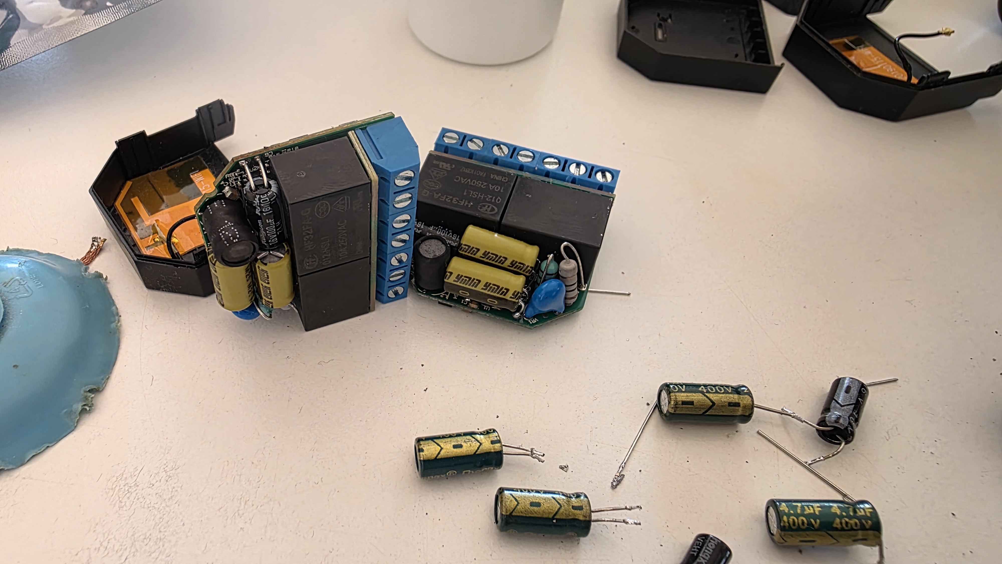Nüüd 2025 lõpus nägin ühte videot, kus üks elektroonikamees, kellel samuti palju Shelly lüliteid, hakkas uurima, et mis seal siis ära väsib ja mõõtis mingi spets mõõteriistaga ära, et suurte elektrolüütkondensaatorite sisetakistus on muutunud ehk pm kondekad on ära kuivanud. Otsis välja uued sama suurusega ja samas mõõdus jupid, vahetas ära ja kõik töötas. Ei tundunud väga keeruline. Ta lisas ka lingid ja kuigi üks neist oli välja müüdud, siis leidsin teise samasuguse ja tellisin ära - kokku igas nutilülitis kaks ühesugust ja üks teistsugune ehk tuli tellida ainult kahte sorti kondekaid.